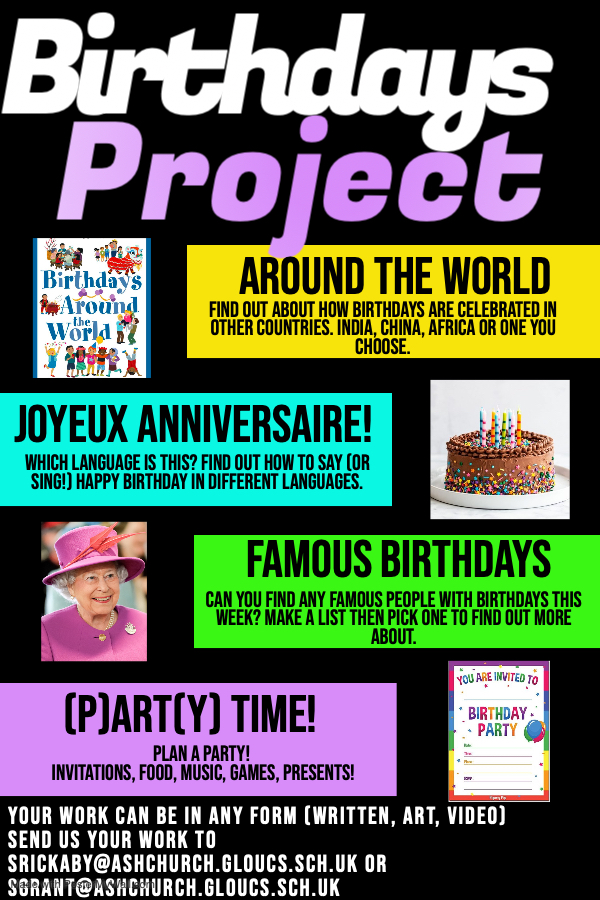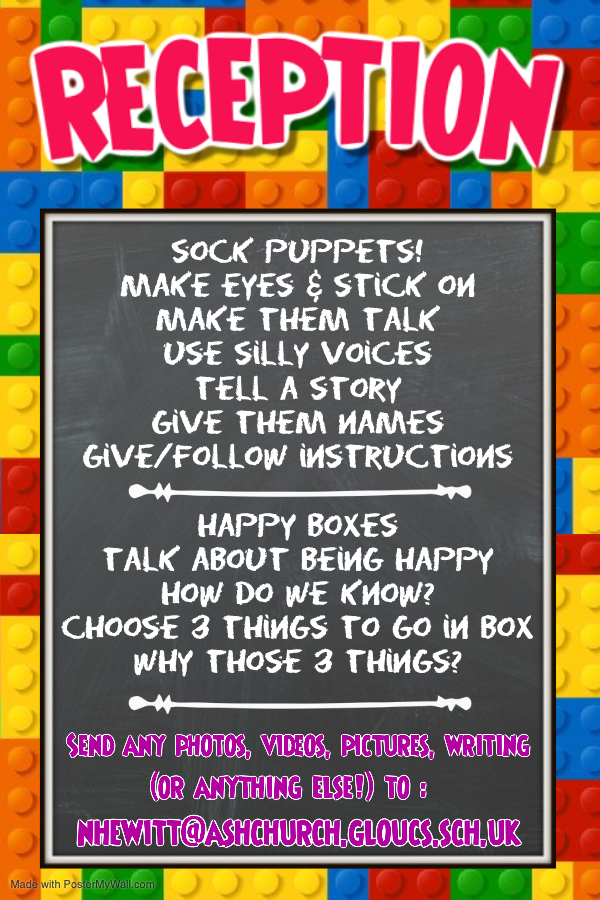 Remember, there is no 'right or wrong' with these projects. It doesn't matter if you spend ten minutes on them, or whether its something you return to every day over the course of the week. The thinking behind these 'flagship' tasks each week is to try and 'reconnect Ashchurch,' sharing and celebrating each child's contribution to a shared class activity.