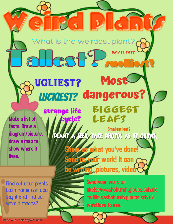 Teachers email addresses to send work to are on each of the posters. Please send there so that we have everything in one place which will allow us to share everything that comes in at the end of the week for the children to see each other's contributions.